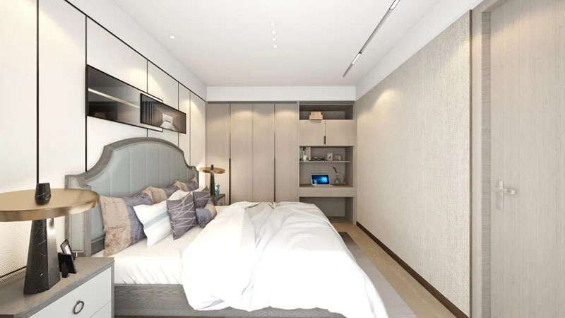 ▲次卧空间主要是以浅色为底调,大面积的莫兰迪色与浅色相平衡。极强线性装饰画带来的延伸感让视觉焕然一新。少许的金属元素摄入,瞬间提升了空间的精致度,将温润雅致与时尚轻奢糅合在同一空间里,每一处都洋溢着浪漫的气息。