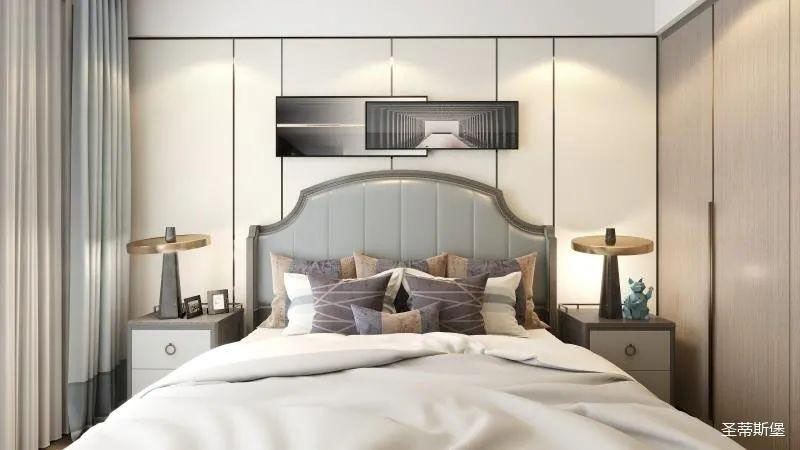 ▲次卧空间主要是以浅色为底调,大面积的莫兰迪色与浅色相平衡。极强线性装饰画带来的延伸感让视觉焕然一新。少许的金属元素摄入,瞬间提升了空间的精致度,将温润雅致与时尚轻奢糅合在同一空间里,每一处都洋溢着浪漫的气息。